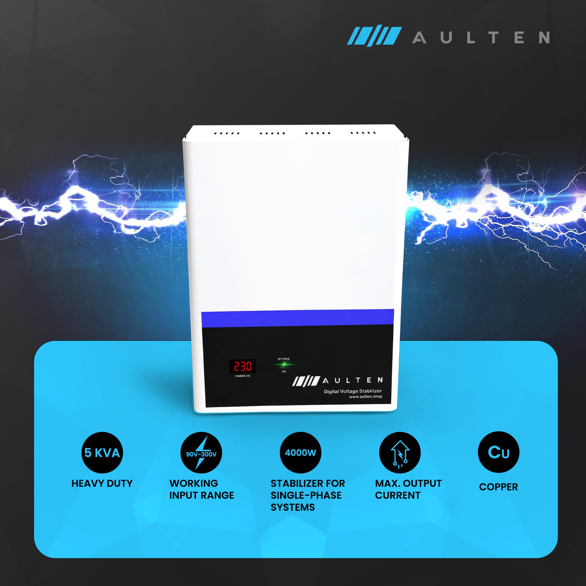 AULTEN COPPER Mainline Voltage Stabilizer for Home 5 KVA Heavy Duty 4000W 90V-300V AD014 (White)