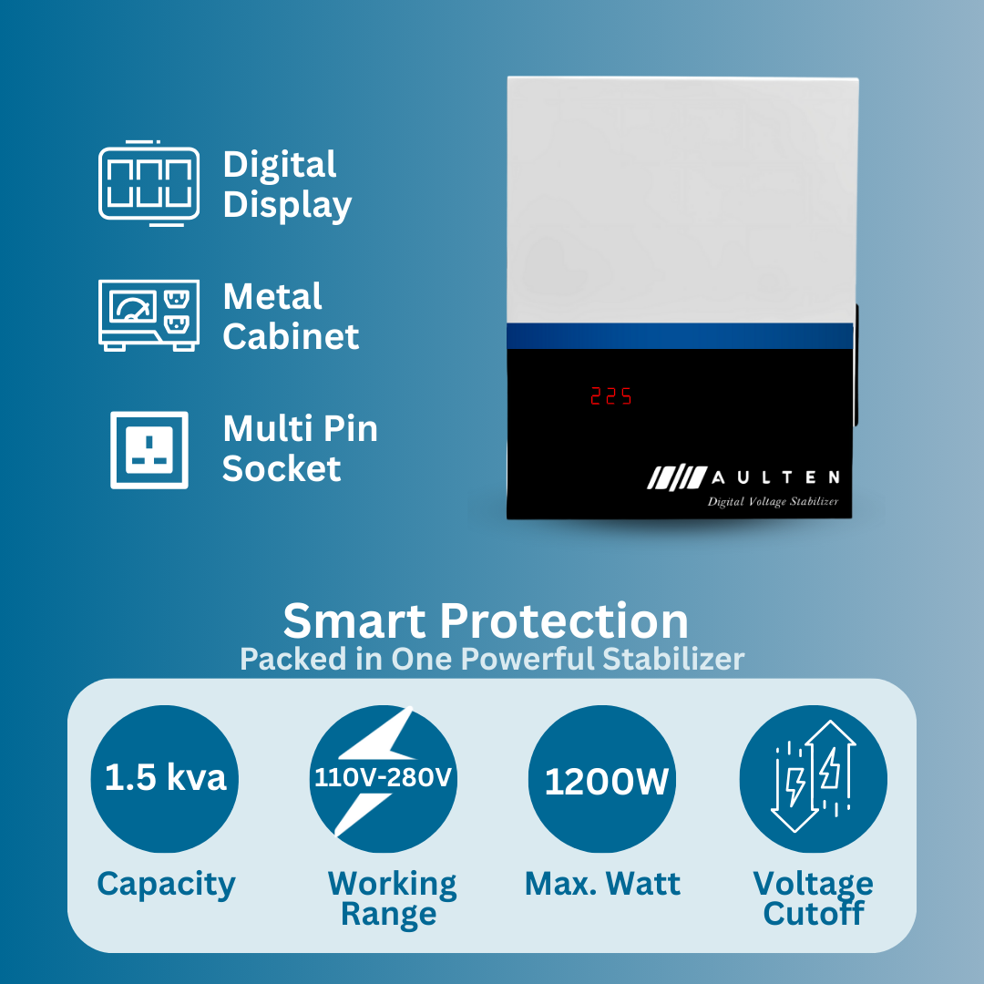 AULTEN Digital Multipurpose Voltage Stabilizer for Refrigerator and Deep Freezer 1.5 KVA 1200W 110V-280V AD030 (White)